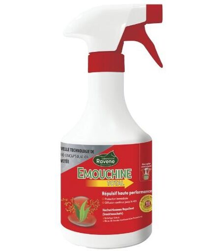Répulsif haute performanceLa nouvelle formule d’Emouchine Total intègre une technologie innovante brevetée qui, grâce à la micro-encapsulation du principe actif issu de l’Eucalyptus citronné, vous débarrasse durablement de la nuisance des insectes.Ces milliards de microcapsules invisibles à l’oeil nu, potentialisent considérablement l’efficacité des actifs. Grâce à une diffusion continue, Emouchine Total vous offre une protection longue durée. Efficace contre les mouches, moustiques, taons, mouches plates, tiques… Odeur fraiche très agréable ! • Fixation des microcapsules sur le poil.• Libération immédiate et progressive des actifs, créant instantanément une sphère protectrice.• Diffusion des actifs lorsque la microcapsule se désintègre suite à un frottement (mouvement du cheval, frottement du matériel…) ...