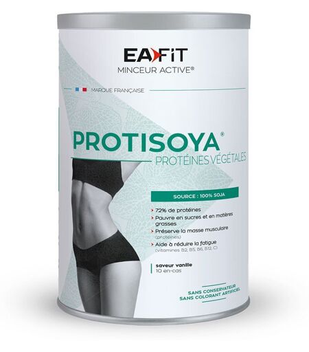 Prenez attention à une alimentation variée et équilibrée et un mode de vie sain.Formulé en laboratoire par les spécialistes d’EAFIT Minceur Active®, PROTISOYA® est un en-cas hyperprotéiné végétal, à base de protéines de soja qui permet de préserver la masse musculaire et la vitalité notamment lors de période de régime.PROTISOYA contient : un taux de protéines optimal pour contribuer à préserver la masse musculaire. de l’isolat de protéines de pois, riz et cranberry qui constitue une tri-source d’acides aminés essentiels. de la vitamine C qui participe au bon fonctionnement du système immunitaire. des vitamines B2, B5, B6, B9, B12 et C pour aider à réduire la fatigue notamment lors de période de régime alimentaire. des fibres alimentaires végétales. un complexe synergisé anti-oxydant, hautement protecteur, associant sélénium, zinc et vitamines C et E qui aident à protéger les cellules contre le stress oxydatif.Composition:Isolat de protéines de soja, oligo-fructose, maltodextrines, fructose, arômes (noisette), L-valine, L-méthionine, L-thréonine, L-lysine, L-isoleucine, L-leucine, L-tryptophane, édulcorants : sucralose - acésulfame de potassium, colorant : bétacarotène, vitamines C - E - PP - A - B5 - B12 - B6 - B2 -B1 - B9 - B8, minéraux : gluconate de zinc - molybdate de sodium - sélénite de sodium, anti-agglomérant : silice (E551). Traces éventuelles de : céréales contenant du gluten, lait, œuf, céleri, sulfites,autres fruits à coque.Valeur nutritionelle: Pour 100 g *AJR Par shaker de 32 g *AJR Énergie 338 kcal/1435 kj 108 kcal/ 459 kj Matières grasses 0,4 g 0,1 g dont acides gras saturés 0 g 0 g Glucides 8,5 g 2,7 g dont sucre 3,2 g 1 g Fibres alimentaires 5,2 g 1,7 g Protéines 72 g 23 g Sel 2,3 g 0,72 g Vitamine A 998 µg 125 % 319 g 40 % Vitamine E 11 mg 94 % 3,6 mg 30 % Vitamines C 80 mg 100 % 26 mg 32 % Vitamine B1 1,1 mg 98 % 0,35 mg 32 % Vitamine B2 1,3 mg 93 % 0,42 mg 30 % Vitamine PP 15 mg 92 % 4,7 mg 30 % Vitamine B5 5,5 mg 92 % 1,8 mg 30 % Vitamine B6 1,3 mg 92 % 0,41 mg 29 % Vitamine B8 46 µg 92 % 15 mg 30 % Vitamine B9 185 µg 92 % 59 µg 30 % Vitamine B12 2,6 µg 103 % 0,82 µg 33 % Sodium 906 mg 290 mg Zinc 9,2 mg 92 % 3,0 mg 30 % Sélénium 51 µg 93 % 16 µg 30 % Molybdene 46 µg 93 % 15 µg 30 % *Apport journalier de référence Acides animés pour 100 g de protéines Valeur pour 100 g Alanine 3,2 g Argine 5,7 g Acide aspartique 9,0 g Cystine 1,6 g Acide glutamique 13,3 g Glycine 3,2 g Histidine 1,7 g Isoleucine 4,0 g Leucine 7,0 g Lysine 5,5 g Méthionine 1,9 g Phénylalanine 4,1 g Proline 4,5 g Sérine 3,7 g Thréonine 4,0 g Tryptophane 1 g Tyrosine 2,9 g Valine 5,0 g Indice chimique 100 Conseil d'utilisation:Prendre 1 en-cas* PROTISOYA® par jour (midi ou soir) accompagné de légumes à volonté ainsi qu’un fruit.PROTISOYA® peut également être utilisé en collation, en remplacement de l’en-cas habituel.*1 en-cas = 1 dosette et demi = 32 g. Précautions d'emploi:Ne pas dépasser la dose recommandée. Bien refermer... ...