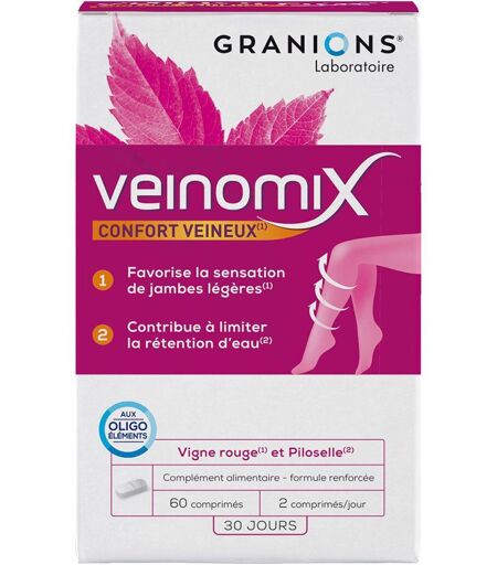 Complément alimentaire à utiliser dans le cadre d’une alimentation variée, équilibrée, d’un mode de vie sain. Le Laboratoire des GRANIONS®, fort de son expertise pharmaceutique depuis 1948, a mis au point GRANIONS® VEINOMIX, une solution complète qui associe les vertus d’une sélection de plantes, de vitamines et d’oligoéléments de haute qualité, pour apporter légèreté, confort et bien-être quotidien à vos jambes. Sa formule renforcée possède une triple action : Améliore le confort veineux et facilite la circulation sanguine : La Vigne rouge, au dosage optimal de 810 mg, est reconnue pour ses bienfaits dans l’amélioration de la circulation sanguine. Elle permet une diminution de la sensation de jambes lourdes en renforçant l’élasticité des vaisseaux sanguins et en tonifiant les veines. La Vigne rouge est associée aux Bioflavonoïdes de citron et aux extraits de Pépins de raisin, d’Hamamélis et de Ginkgo Biloba pour avoir uneaction complète. Contribue à limiter la rétention d’eau : L’extrait de Piloselle permet de limiter la rétention d’eau en favorisant son élimination et celle des toxines. Cette action est completée par la présence d’un extrait d’Ananas. De plus, l’association de Magnésium et de Potassium aide au bon fonctionnement musculaire. Protège contre le stress oxydatif : L’action synergique des Vitamines C et E permet de diminuer le stress oxydatif. La Vitamine C contribue également à la formation normale de collagène pour assurer le fonctionnement normal des vaisseaux sanguins. Cette action anti-oxydante est complétée par la présence de Sélénium et de Cuivre, deux oligo-élèments essentiels. Pour terminer, ce complexe anti-oxydant est associé à la Sophora japonica titrée à 95% en quercétine et à la rutine. Composition: Carbonate de magnésium (amidon de maïs) - levure de sélénium – gluconate e cuivre, biofl avonoïdes de citron, extrait de vigne rouge**, extrait d’ananas**, texturant : chlorure de potassium, vitamines : C - E (amidon alimentaire modifi é, maltodextrine, [nano] dioxyde de silicium) - B6, extrait de piloselle**, extrait de pépins de raisin**, anti-agglomérants : cellulose microcristalline (E460) - stéarate de magnésium (E470b), poudre de ginkgo biloba, extrait d’hamamélis**, sophora japonica 95% quercétine, rutine. Ingrédients d’enrobage : hydroxypropylméthylcellulose (E464), cellulose microcristalline (E460), colorants : dioxyde de titane (E171) - cochenille (E120) - indigotine (E132), anti-agglomérant : acide stéarique (E570). **Sur support maltodextrine. Valeur nutritionelle: Pour 2 comprimés % VNR* Bioflavonoïdes de citron (35%) 400 mg Extrait de vigne rouge 202,5 mg - Soit équivalent plante 810 mg Extrait d’ananas 250 GDU 200 mg Extrait de piloselle 100 mg - Soit équivalent plante 400 mg Extrait de pépins de raisin 70 mg Poudre de ginkgo biloba 50 mg Extrait d’hamamélis 50 mg - Soit équivalent plante 200 mg Sophora japonica 45 mg - Dont quercétine 42,75 mg Rutine 40 mg Vitamine C 80 mg 100 %... ...