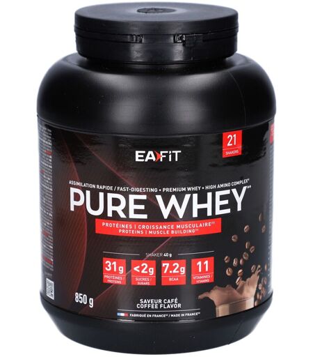 Complément alimentaire à utiliser dans le cadre d’une alimentation variée, équilibrée et d’un mode de vie sain.La Pure Whey est la protéine la plus répandue sur le marché. Elle est majoritairement composée de concentrat, un type de protéine ayant un rapport qualité prix très intéressant. C’est une protéine à assimilation rapide qui va permettre le développement musculaire et favoriser la récupération. Elle possède un aminogramme complet ainsi que des glucides et des lipides. IngrédientsConcentrat de protéines de lactosérum (LAIT) 65,92% (émulsifiant : lécithines tournesol/SOJA, anti-agglomérant : phosphate tricalcique), isolat de protéines de lactosérum (LAIT) 25% (lécithines tournesol/SOJA), café soluble 3%, arômes (LAIT) (anti-agglomérant : silice [nano], acidifiant : acide lactique), arôme naturel (triglycérides d’acide gras, stabilisant : gomme arabique), épaississant : gomme xanthane, L-glutamine, L-arginine (SOJA), oxyde de magnésium, taurine, agent de charge : maltodextrine, édulcorant : acésulfame de potassium, complexe enzymatique (alpha amylase, protéase, lactase, lipase, cellulase), vitamine C, édulcorant : sucralose, pyrophosphate de fer, vitamines : E-B3-A (amidon de maïs, épaississant : gomme arabique, anti-oxydant : alpha tocophérol) -B5-B6-B2-B12-B1-B9-B8..Allergènes : Soja, Lait.Valeurs nutritionnellesÉlémentPour 100gAR*Par shaker 40gAR*Énergie1635 kJ / 386 kcal/654 kJ / 154 kcal/Matières grasses4,1 g/1,7 g/Dont acides gras saturés2,3 g/0,9 g/Glucides10 g/4 g/Dont sucres4.8 g/1.9 g/Fibres alimentaires0,8 g/0,3 g/Protéines77 g/31 g/Sel0,88 g/0,35 g/Vitamine A564 µg71%225 µg28%Vitamine E9,2 mg77%3,7 mg31%Vitamine C39 mg50%15 mg20%Vitamine B10,88 mg80%0,35 mg32%Vitamine B21 mg72%0,4 mg29%Vitamine B311 mg74%4,5 mg30%Vitamine B53,7 mg63%1,5 mg25%Vitamine B61,2 mg89%0,5 mg36%Vitamine B893 µg187%37 µg75%Vitamine B9125 µg63%50 µg25%Vitamine B121 µg42%0,42 µg17%Calcium303 mg38%121 mg15%Potassium737 mg37%295 mg15%Phosphore270 mg39%108 mg15%Magnésium215 mg58%86 mg23%Fer8.1 mg58%3.2 mg23%L-Glutamine250 mg/250 mg/L-Arginine250 mg/250 mg/Taurine56,6 mg/56,26 mg/Complexe Enzymatique100 mg/40 mg/BCAA17,9 g/7,2 g/Conseils d'utilisationIl est recommandé d’utiliser 2 shakers par jour afin de venir compléter les apports protéiques issus de l’alimentation. Précautions d'emploiPréparation hyperprotidique pour boisson sous forme de poudre avec édulcorants. Ne pas dépasser la dose recommandée. Il est conseillé de consommer ce complément dans le cadre d’une alimentation variée et équilibrée et d’un mode de vie sain. Bien refermer après ouverture. À conserver à l’abri de la chaleur et de l’humidité. Tenir hors de portée des jeunes enfants. À consommer de préférence avant la date indiquée sur le pot.Poids net850 gAdresse du FabricantSASU EQUILIBRE ATTITUDE ZAC du Font de l’Orme 1198, avenue du Docteur Maurice Donat06250 MOUGINS, FRANCE ...