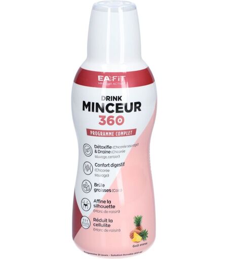 Complément alimentaire à utiliser dans le cadre d’une alimentation variée, équilibrée et d’un mode de vie sain.Eafit Drink Minceur 360 est une solution buvable concentrée, élaborée à base de 10 plantes sélectionnées pour agir sur 6 actions minceur : détoxification, drainage, digestion, combustion des graisses, affinage de la silhouette et réduction de la cellulite. Idéal en cure de 21 jours, il est aromatisé à l’ananas et formulé sans gluten, sans lactose, sans sucre ajouté et sans colorant.IngrédientsEau, macérat de plantes : cassis (Ribes nigrum), chardon marie (Silybum marianum), chicorée (Cichorium intybus), artichaut (Cynara scolymus), aubier de tilleul (Tilia cordata), chiendent (Agropyron repens), piloselle (Hieracium pilosella), stabilisant : glycérine, fructo-oligosaccharides, extrait de queue de cerise (Prunus cerasus), acidifiants : acide citrique, épaississant : gomme de xanthane, édulcorant : sucralose, sel de potassium, extrait de NOIX de kola (Cola nitida), caféine, extrait de marc de raisin (Vitis vinifera).Allergènes : Fruits à coques.Valeurs nutritionnelles Pour 30 mlÉquivalent plantes Cassis228 mg- Chardon marie228 mg- Chicorée228 mg- Artichaut228 mg- Aubier de tilleul111 mg228 mg Chiendent111 mg226 mg Piloselle111 mg4080 mg Extrait de queue de cerise40 mg- Extrait de noix de kola2,4 mg- Caféine totale1,5 mg- Extrait de marc de raisin1,5 mg- Conseils d'utilisationÀ boire le matin, à l’aide du bouchon doseur.Phase d’attaque : 30 ml par jour dans un grand verre d’eau.Phase d’entretien : 15 ml par jour.Bien agiter avant emploi. Programme de 21 jours.Précautions d'emploiNe pas dépasser la dose recommandée. Réservé à l’adulte. Déconseillé aux femmes enceintes et allaitantes. Déconseillé aux personnes souffrant d’insuffisance cardiaque ou rénale, d’allergies croisées connues aux plantes de la famille des astéracées, ou de troubles biliaires. Tenir hors de portée des enfants.Poids net500 mlAdresse du FabricantÉquilibre Attitude1198, avenue du Dr Maurice Donat06250 Mougins – France ...