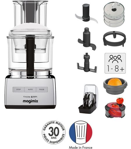 Fabriqué en France, le robot MAGIMIX C.S. 5200 XL Premium est un appareil complet permettant de hacher, râper, émulsionner ou pétrir tous les types d'aliments. Faites de la place dans votre cuisine en; utilisant un seul appareil pour réaliser toutes vos préparations culinaires. UN ROBOT MULTIFONCTIONNEL POUR TOUT CUISINER Le robot MAGIMIX C.S. 5200 XL Premium est un appareil complet qui permet de réaliser toutes les préparations pénibles à faire à la main. Equipé de plusieurs disques, il vous permet de râper,; émincer, pétrir, battre et hacher à; la fois des légumes, des viandes ou du fromage. En plus des fonctions traditionnelles, ce robot offre aussi un BlenderMix, idéal pour réaliser des soupes à la fois crémeuses et légères, un presse agrumes et un extracteur Extra Press XL pour réaliser jus, smoothies et lais végétaux maison pleins de vitamines. Le robot MAGIMIX C.S. 5200 XL Premium s'accompagne également d'un coffret 3 disques parmesan, éminceur 1 mm et râpeur 6 mm. Ainsi que d'un livre de 100 recettes et d'une application gratuite. UNE GRANDE SIMPLICITÉ D'UTILISATION Le robot MAGIMIX C.S. 5200 XL Premium a été conçu pour vous simplifier la vie. Ainsi, il dispose de 3; bols transparents pour; enchaîner les préparations. L'ensemble des bols et des accessoires se nettoie tout simplement au lave-vaisselle. Une boîte de rangement est fournie avec l'appareil. Quant aux réglages :; impossible de se tromper !; Le moteur; s'adapte automatiquement au type de préparation que vous souhaitez réaliser. Il dispose également d'une fonction Pulse pour faire mousser vos soupes et cocktails. LA QUALITÉ DE FABRICATION FRANÇAISE POUR UNE DURABILITÉ GARANTIE Entièrement fabriqué en France, ce robot multifonctions Magimix est équipé d'un moteur professionnel garanti 30 ans et ses pièces détachées sont également disponibles 30 ans. Ses accessoires conçus en acier inoxydable vous offrent une qualité de coupe parfaite. ; ...