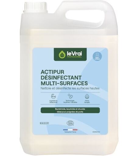 Nettoie et désinfecte . multi-surfaces. mobiliers et petits objets. téléphones. poignées. rampes. boutons d’ascenseurs. claviers. interrupteurs...Contact alimentaire.Action virucide. bactéricide et levuricide : efficacité couverte sur Coronavirus.Certifié Ecocert.Composition à base de 99.5% d'ingrédients biosourcés.Ne pas appliquer sur les bois huilés ou cirés / le marbre / le béton/ le ciment. ◉ Détails : Usage : bactéricide dégraissant désinfectant levuricide virucide ◉ Support compatible : multi-surface ◉ Environnement d'entretien : ménager ◉ Compatibilité alimentaire : oui ◉ Contenance : 5 L ◉ ◉ EAN : 3519220055129 ◉ Marque : LE VRAI PROFESSIONNEL ◉ Référence : 5512 ◉ Catégorie : Consommables/Nettoyage et entretien/Produits de nettoyage et d'entretien ...