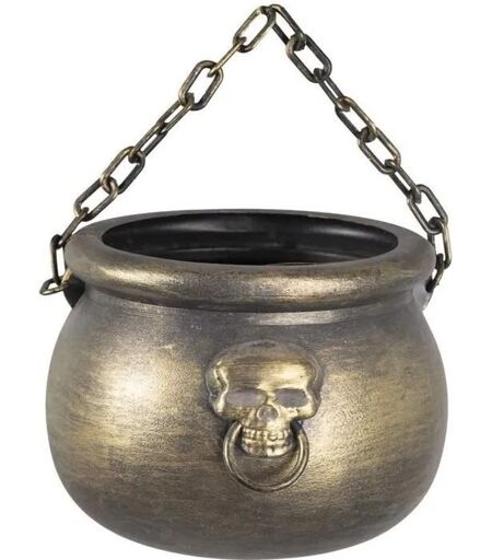 Chaudron de sorcière doré avec incrustation 3D d'une tête de mort et chaine permettant de le suspendre. En plastique. Diamètre : 23 cm ...