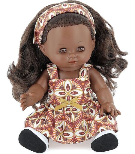 Poupée Câlinette 28 cm Norah, avec yeux bruns. Fabrication artisanale française. Cette poupée est entièrement fabriquée en vinyle souple, avec un délicat parfum de vanille, au sein de l'atelier Petitcollin situé à Étain en France. Cette poupée possède des yeux dormeurs bruns avec cils et de longs cheveux bruns. Sa tenue se compose d'une jolie robe colorée, assortie à son ruban dans les cheveu ...