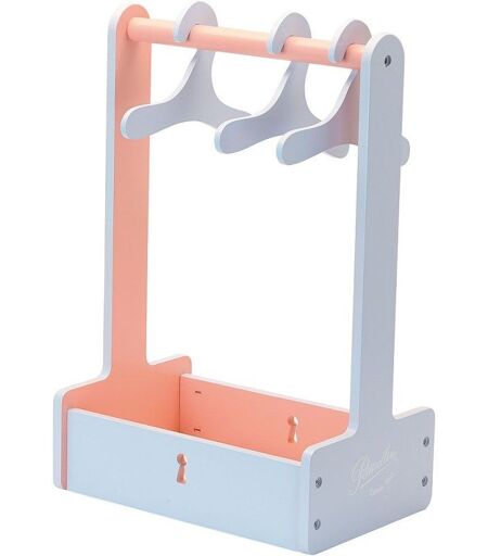 Dressing en bois pour poupée de la marque Petitcollin. Une penderie en bois pour ranger les vêtements des poupées. Fournis avec 3 cintres. Vêtements non compris. Référence 800216. ...