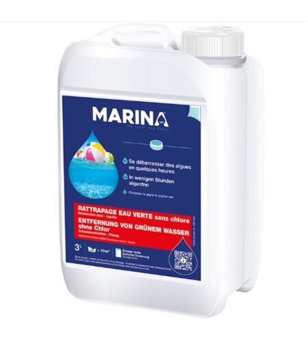 Une action rapide contre l'eau verte Votre eau a tourné et est verte, il n'est pas trop tard, il faut utiliser le Liquide Rattrapage Eau Verte de Marina. Ce traitement a un effet rapide et rendra à votre piscine son aspect basique. Un traitement pour une bonne eau sur le long terme Le produit : Ne contient pas de chlore A un effet rapide Détruit les algues et prévient leur réapparition Ce produit s'utilise uniquement en cas d'eau verte. Comment utiliser le Rattrapage eau verte de Marina Ce produit s'utilise : Dans les piscines de 10 à 20 m 3 Lorsque l'eau de la piscine est verte 1- Ajuster le pH entre 7 et 7,4 2- Verser le produit autour du bassin. Dosage de 1,5L pour 10m 3 Précautions d'emploi Conserver au sec, dans un endroit bien ventilé, à une température moyenne journalière n'excédant pas 35°C Ne mélanger à aucun autre produit Il existe également des produits préventifs pour un traitement anti algues de votre piscine. Recommandations : Utilisez les biocides avec précaution. Avant ...