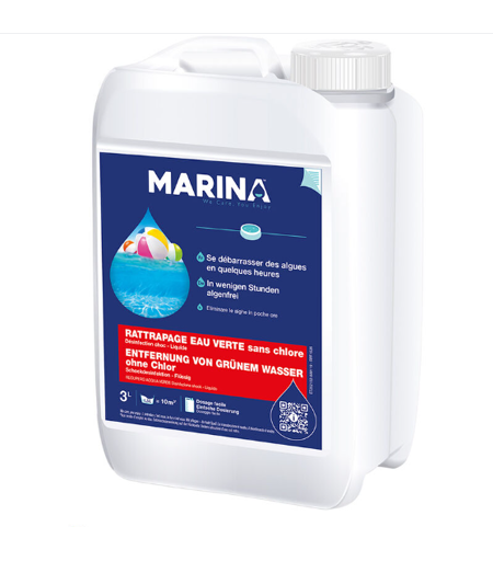 Description du produit Optez pour le SOS Rattrapage eau verte Marina sans chlore Bidon gradué Action choc sans chlore Effet rapide en quelques heures Détruit les algues et prévient leur réapparition Action anti-algues renforcée Disponible en 3 L et 5 L Sans chlore : conforme à la réglementation sur les précurseurs d'explosifs Mode d'emploi Analyse idéale : pH entre 7,0 et 7,4 / Cl 2 mg/l Dosage : 1,5 L pour 10 m3 Comment : répartir le produit autour du bassin Clause de non-garantie Utilisez les produits biocides avec précaution. Avant toute utilisation, lisez l'étiquette et les informations concernant le produit. Use biocides with caution. Before use, read the product label and information Numéro d'inventaire : 78516 ...