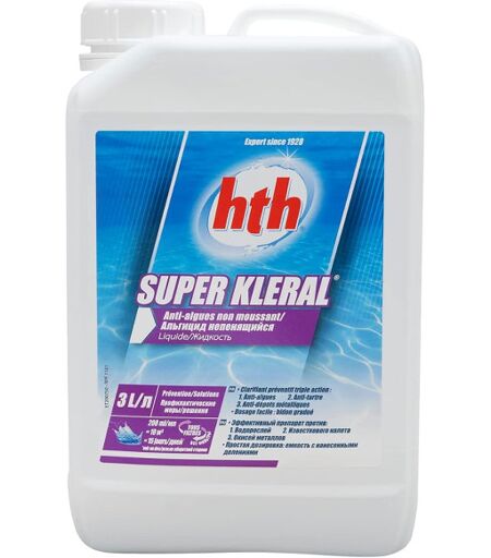 Descriptif de hth Super KLERAL anti-algues antitartre séquestrant métaux piscine Vous avez une piscine familiale ? Vous possédez une grande famille avec enfants ou vous avez l'habitude de convier beaucoup de baigneurs ? Ne cherchez plus, voici le produit de traitement idéal pour les piscines agitées telle que la vôtre ! Super KLERAL hth liquide assure 3 actions d'entretien de votre eau : Il combat les algues survenues par les bactéries et l'air atmosphérique Il combat le tartre Il séquestre les dépôts métalliques Avec hth Super KLERAL, vous obtenez une eau claire et cristalline, bien traitée. C'est l'assurance d'une baignade agréable. Exclusif sur le marché, le produit est reconnu non moussant, sans cuivre et efficace quel que soit le taux de pH de votre eau. Pour une meilleure optimisation de la qualité de l'eau (préventif), vous pouvez associer Super KLERAL hth anti-algues avec les produits à base d'oxygène actif. Produit compatible avec le PHMB Dosage standard : - A la mise en service = 200 ml pour 10 m3 d'eau - Toutes les deux semaines = 200 ml pour 10 m3 d'eau - Curatif = 400 ml pour 10 m3 d'eau Produit non moussant aux dosages recommandés Utilisez les produits chimiques de traitement d'eau avec précaution. Avant toute utilisation, lisez les consignes inscrites sur l'emballage du produit. ...