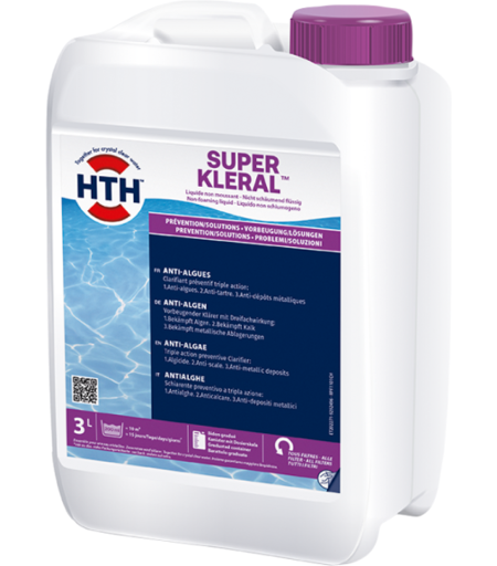 Descriptif de hth Super KLERAL anti-algues antitartre séquestrant métaux piscine Vous avez une piscine familiale ? Vous possédez une grande famille avec enfants ou vous avez l'habitude de convier beaucoup de baigneurs ? Ne cherchez plus, voici le produit de traitement idéal pour les piscines agitées telle que la vôtre ! Super KLERAL hth liquide assure 3 actions d'entretien de votre eau : Il combat les algues survenues par les bactéries et l'air atmosphérique Il combat le tartre Il séquestre les dépôts métalliques Avec hth Super KLERAL, vous obtenez une eau claire et cristalline, bien traitée. C'est l'assurance d'une baignade agréable. Exclusif sur le marché, le produit est reconnu non moussant, sans cuivre et efficace quel que soit le taux de pH de votre eau. Pour une meilleure optimisation de la qualité de l'eau (préventif), vous pouvez associer Super KLERAL hth anti-algues avec les produits à base d'oxygène actif. Produit compatible avec le PHMB Dosage standard : - A la mise en service = 200 ml pour 10 m3 d'eau - Toutes les deux semaines = 200 ml pour 10 m3 d'eau - Curatif = 400 ml pour 10 m3 d'eau Produit non moussant aux dosages recommandés Utilisez les produits chimiques de traitement d'eau avec précaution. Avant toute utilisation, lisez les consignes inscrites sur l'emballage du produit et rendez-vous sur le site officiel du fabricant depuis notre page dédiée à la marque hth® ...