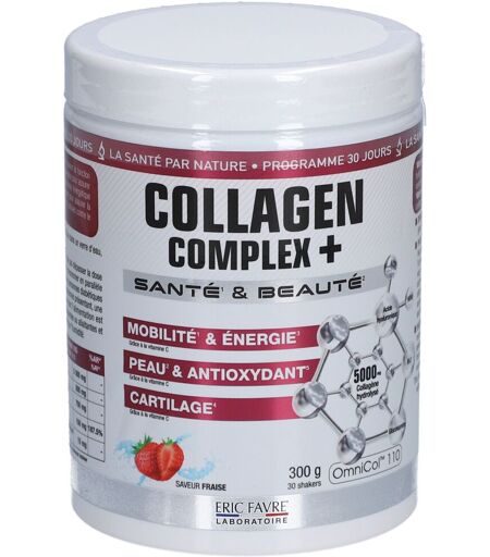 Complément alimentaire à utiliser dans le cadre d’une alimentation variée, équilibrée et d’un mode de vie sain.Le collagène est considéré comme la protéine la plus abondante du corps humain, puisqu'il représente près de 30% de la teneur protéique totale. On le retrouve majoritairement dans la peau, les os et articulations, mais également autour des fibres musculaires. De ce fait, il apporte flexibilité et protections des tissus, et contribue également à la croissance musculaire ainsi qu'à la cicatrisation. Autrement dit, c'est grâce à cette protéine que votre peau est belle et rafermie, et que vous contribuez à un certain confort musculaire et articulaire.Néanmoins, à partir de 25 ans, la production de collagène diminue de 1% chaque année, c'est pourquoi il devient interessant de se complémenter, afin de ne pas en perdre les bénéfices.Collagen Complex+ est une formule ultra complète à base de collagène, à laquelle ont été ajoutés plusieurs nutriments afin de maximiser son efficacité, ainsi que son assimilation. On retrouve tout d'abord la vitamine C, sans laquelle le collagène ne serait pas synthétisé ni assimilé. Cette dernière lutte également contre le stress oxydatif , et soutient le métabolisme énergétique normal.Vient ensuite l'acide hyaluronique, qui apparait très souvent en complément du collagène car ils vont de pair. En effet, celui-ci améliore l'hydratation ainsi que l'élasticité de la peau, soutient la lubrufication articulaire, et favorise la régénération des tissus.On retrouve du glucosamine, qui va également contribuer à la lubrification ainsi qu'au fonctionnement articulaire, et lutter contre l'inflammation. Ajouté à cela, il va être précurseur d'acide hyaluronique et de chondroïtine, un constituant essentiel des cartilages.Enfin, l'ajout de MSM (Méthyl-sulfonyl-méthane) va permettre d'augmenter la densité osseuse, tout en contribuant à la formation de collagène. Ce dernier a également un pouvoir anti-oxydant, et permet de réduire l'inflammation.Collagen Complex+ est donc l'allié parfait à consommer quotidiennement pour retrouver une peau éclatante et rebondie, ainsi que des articulations en bonne santé, et un regain d'énergie !IngrédientsCOLLAGÈNE BOVIN** ; AGENT DE CHARGE : MALTODEXTRINE (LAIT) ; MÉTHYL-SULFONYL-MÉTANE (MSM) ; GLUCOSAMINE (CRUSTACÉS ET PRODUITS À BASE DE CRUSTACÉS) ; RÉGULATEUR D’ACIDITÉ : ACIDE CITRIQUE ; ARÔME (2.5%) ; VITAMINE C ; ÉPAISSISSANT : GOMME DE GUAR ; POUDRE DE JUS DE BETTERAVE ; ÉDULCORANT : SUCRALOSE ; ACIDE HYALURONIQUE.**Non origine FranceAllergènes : Crustacé, Lait.Valeurs nutritionnellesCollagèneMSMGlucosamineVitamine CAcide hyaluronique 5000 mg800 mg750 mg150 mg15 mgConseils d'utilisationPrendre une cuillère de 10 g par jour diluée dans un verre d'eau, le matin lors de votre petit-déjeuner.Précautions d'emploiSe conformer aux conseils d’utilisation. Ne pas dépasser la dose journalière recommandée. Tenir hors de portée des jeunes enfants. À consommer en parallèle d’une alimentation diversifiée... ...