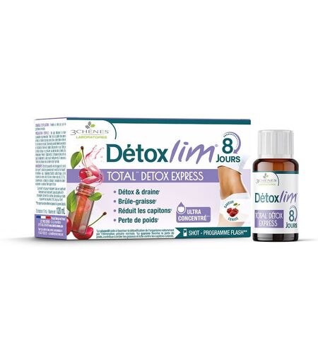Complément alimentaire à utiliser dans le cadre d’une alimentation variée, équilibrée et d’un mode de vie sain.3 Chênes Detoxlim est une cure de détoxification express en 8 shots, spécialement formulée pour aider à éliminer les toxines et soutenir la perte de poids. Grâce à une synergie d'extraits végétaux tels que pissenlit, guarana, bruyère, queues de cerise, framboise et bromélaïne, ce complément alimentaire stimule les fonctions d'élimination et favorise le drainage de l'organisme. Idéal pour amorcer une période de remise en forme ou après des excès.IngrédientsExtrait de pissenlit, Extrait de guarana*, Extrait de bruyère*, Extrait de queues de cerise*, Extrait de framboise*, Bromélaïne, Eau, Régulateur d’acidité : acide citrique, Arôme naturel de cerise avec autres arômes naturels (0,2 %), Conservateurs : sorbate de potassium, benzoate de sodium, Édulcorant : sucralose. *Non originaires de FranceConseils d'utilisationPrendre 1 shot par jour, de préférence le matin. Cure de 8 jours.Précautions d'emploiNe pas dépasser la dose journalière recommandée. Réservé à l’adulte. Déconseillé aux femmes enceintes ou allaitantes. Ne convient pas aux personnes allergiques, en particulier aux plantes de la famille des Astéracées. Consultez un professionnel de santé en cas de traitement médical. Ne pas utiliser comme substitut d’un régime alimentaire varié et équilibré.Poids net8 shots de 10 ml = 80 mlAdresse du FabricantLes 3 Chênes10 Allée de Cindais69510 Rontalon – France ...