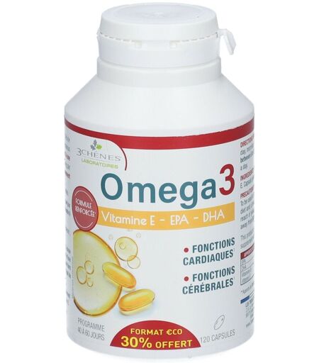 Complément alimentaire à utiliser dans le cadre d’une alimentation variée, équilibrée et d’un mode de vie sain.Formule renforcée en Vitamine E, EPA & DHA pour le cœur et le cerveauL’Acide Eicosapentaénoique (EPA) et l’Acide Docosahexaénoique (DHA) sont des Oméga 3 reconnus pour leurs bienfaits sur les fonctions cardiaque et cérébrale.(1) L’EPA et le DHA contribuent à une fonction cardiaque normale.(2) Le DHA contribue également au fonctionnement normal du cerveau.Composition:Huile de poisson (non origine France), vitamine E, tunique: gélatine, glycérine.Valeur nutritionnelle: Pour 3 capsulesAJR*EPA540 mg DHA360 mg Vitamine E40,2 mg335 %* Apport journalier de référenceConseil d'utilisation:Prendre 2 à 3 capsules par jour le matin, pendant le petit déjeuner.Pour les Enfants entre 6 et 10 ans, prendre 2 capsules maximum par jour.Précautions d'emploi:Ne pas dépasser la dose journalière recommandée. Tenir hors de portée des jeunes enfants. À conserver à l'abri de la lumière, de la chaleur et de l'humidité.Poids net:164,88 g = 120 capsulesFabricant:Les 3 ChênesParc d'Activités69770 VILLECHENEVE ...