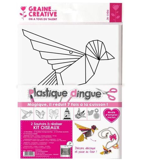 Contenu: 2 feuilles de plastiques dingue , 2 chaînes sautoirs, 10 anneaux brisés, 1 feuilles de modèle. Un très joli kit pour réaliser des bijoux fantaisies au design moderne et graphique. A partir de 6 ans. Nous recommandons d'accompagner l'enfant pour la réalisation, le chauffage au four doit être réalisé par un adulte. Astuce: une craie grasse à paillette pour plus d'effet ...