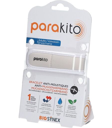 Le bracelet anti-moustique ParaKito pour adultes est une aide anti-moustique rechargeable à base de principes actifs d'origine végétale.Informations importantes:Jusqu'à 15 jours par plaquette, Aux huiles essentielles de géraniol ; Résistant à l'eau et pour toute la famille (femmes enceintes, personnes sensibles et enfants à partir de 3 ans)Indication:Protection contre les moustiquesEffets secondaires:Ne pas utiliser chez l'enfant de moins de 3 ans. Ne convient pas à l'ingestion.Ingrédients actifs:Citrepel, huiles essentielles de lavande et huiles essentielles de menthe poivrée.Citrepel, huiles essentielles de lavande et huiles essentielles de menthe poivrée.Citrepel, huiles essentielles de lavande et huiles essentielles de menthe poivrée.Application:Ouvrir la pochette du coussin actif et la rentrer sous le filet de protection, se laver les mains après avoir manipulé le coussin actif. Il peut être porté au poignet, à la cheville ou sur tout autre support mobile (ceinture, sac à dos, etc.) ou fixe (table, montant de lit, etc.) grâce à son attache réglable. Entre deux utilisations, le bracelet peut être rangé dans l'emballage fourni.Conseils de rangement et d'utilisation :Utiliser les biocides avec précaution.Lire la description sur l'emballage.Tenir hors de portée des enfants.Ne pas avaler ni aspirer. ...