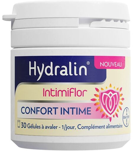 Complément alimentaire à utiliser dans le cadre d'une alimentation variée, équilibrée et d'un mode de vie sain.Hydralin® IntimiFlor est un complément alimentaire avec une association de 4 souches microbiotiques : Lactobacillus helveticus, Lactobacillus plantarum, Lactobacillus rhamnosus, Bifidobacterium lactis, et de vitamine B2. La vitamine B2 contribue au bon fonctionnement des parois vaginales.IngrédientsAmidon de maïs ; agent d’enrobage : hydroxypropylméthylcellulose ; antiagglomérant : mono et diglycérides d'acides gras ; Bifidobacterium lactis ; Lactobacillus helveticus ; Lactobacillus plantarum ; Lactobacillus rhamnosus ; antiagglomérant : sels de magnésium d'acides gras ; vitamine B2. Contient des traces de soja. Peut contenir des traces de lait (dont lactose), anhydride sulfureux et sulfites.Données nutritionnelles Pour 1 gélule %AJR* Vitamine B12 1,4 mg 100 % Bifidobacterium lactis Lactobacillus helveticus Lactobacillus plantarum Lactobacillus rhamnosus 4 milliards d’UFC - *Valeur nutritionnelle de référenceConseils d'utilisationsL’avis d’un professionnel de santé est conseillé pour la femme enceinte ou allaitante, ainsi que pour les femmes souffrant de déficit immunitaire.Tenir hors de la portée des jeunes enfants.Ne pas utiliser en cas d’hypersensibilité à l’un des ingrédients. Contient des traces de soja. Peut contenir des traces de lait (dont lactose), anhydride sulfureux et sulfites.Ne pas dépasser la dose journalière recommandée.Adultes et adolescentes de plus de 16 ans.Précautions d'emploiL’avis d’un professionnel de santé est conseillé pour la femme enceinte ou allaitante, ainsi que pour les femmes souffrant de déficit immunitaire. Tenir hors de portée des jeunes enfants. Ne pas utiliser en cas d’hypersensibilité à l’un des ingrédients. Ne pas dépasser la dose journalière recommandée. Conserver à une température ne dépassant pas 25°C.Poids net14,85g = 30 gélulesFabricantBayer Healthcare SAS33, Rue de l'industrieF-74240 Gailand ...