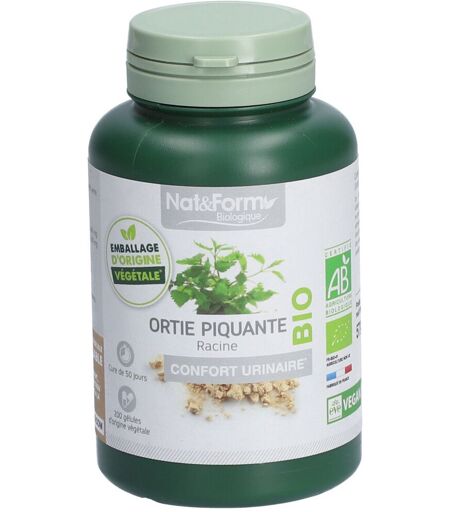 Complément alimentaire à utiliser dans le cadre d’une alimentation variée, équilibrée et d’un mode de vie sain.Originaire des régions tempérées de l’Eurasie, l’ortie piquante est une herbacée vivace très commune autour des habitations. On connait majoritairement la feuille d’ortie mais sa racine est aussi utilisée pour se sentir plus énergique.IngrédientsPoudre de racines d’ortie piquante, Gélatine.Valeurs nutritionnelles Pour 6 gélules %AJR* Poudre de racines d’ortie piquante 1260 mg Gélatine 450 mg *Poudre issue de l’agriculture biologique.Conseils d'utilisation3 à 6 gélules par jour. A avaler avec un grand verre d’eau au milieu des repas.Précautions d'emploiLes compléments alimentaires doivent être utilisés dans le cadre d’un mode de vie sain et ne pas être utilisés comme substituts d’un régime alimentaire varié et équilibré. Ne pas dépasser la dose journalière préconisée. Tenir hors de portée des enfants. La conservation s’effectue dans un endroit sec et à l’abri de la lumière. Enfants de moins de 12 ans, femmes enceintes ou allaitantes, consulter un professionnel de santé avant utilisation. Demandez l’avis de votre médecin et/ou pharmacien avant utilisation.Poids net57 g = 200 gélulesAdresse du FabricantLaboratoire Atlantic NatureZA de Kerloudan56270 Ploemeur ...