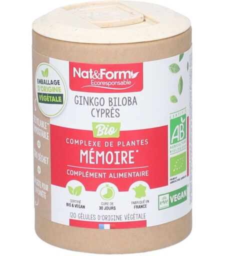 Complément alimentaire à utiliser dans le cadre d’une alimentation variée, équilibrée et d’un mode de vie sain.Complément alimentaire BIO.Le Ginkgo biloba est un grand arbre existant sur la Terre depuis plus de 300 millions d’années. Originaire de la région asiatique, il est aujourd’hui répandu dans de nombreux pays. Il aide à maintenir la mémoire au fil du vieillissement et à préserver les fonctions cognitives en contribuant à une circulation normale du sang qui est associée aux performances cérébrales et à la réactivité. Il entretient également le bien-être mental en maintenant l’attention sur la mémoire à court terme et pendant les moments de stress accru en maintenant la concentration.IngrédientsExtrait aqueux de feuilles de Ginkgo biloba biologique*, Poudre de NOIX de cyprès biologique, Gélule d'origine végétale.*Poudres issues de l'agriculture biologiqueAllergènes : Fruits à coques.Valeurs nutritionnelles Pour 4 gélules %AJR* Extrait aqueux de feuilles de Ginkgo biloba biologique* 500 mg Poudre de noix de cyprès biologique 500 mg Gélule d’origine végétale 300 mg *Poudres issues de l’agriculture biologique.Conseils d'utilisation4 gélules par jour. À avaler avec un grand verre d’eau au milieu des repas.Précautions d'emploiLes compléments alimentaires doivent être utilisés dans le cadre d'un mode de vie sain et ne pas être utilisés comme substituts d'un régime alimentaire varié et équilibré. Ne pas dépasser la dose journalière préconisée. Tenir hors de portée des enfants. La conservation s'effectue dans un endroit sec et à l'abri de la lumière. Étant donné le caractère naturel du bouchon, ce produit est à conserver dans un endroit sec, ventilé et à l'abri de toute humidité. Réservé à l'adulte. Déconseillé aux personnes sous traitement anti-dépresseur ainsi qu'aux femmes enceintes ou allaitantes. Déconseillé en cas d’épilepsie ou en cas d’acte interventionnel invasif programmé. En cas de traitements médicamenteux, demander conseil à un professionnel de santé avant utilisation, notamment en cas de de prise simultanée d'anticoagulant ou antiagrégants plaquettaires.Poids net39 g = 120 gélulesAdresse du FabricantLaboratoire Atlantic NatureZA de Kerloudan56270 Ploemeur ...