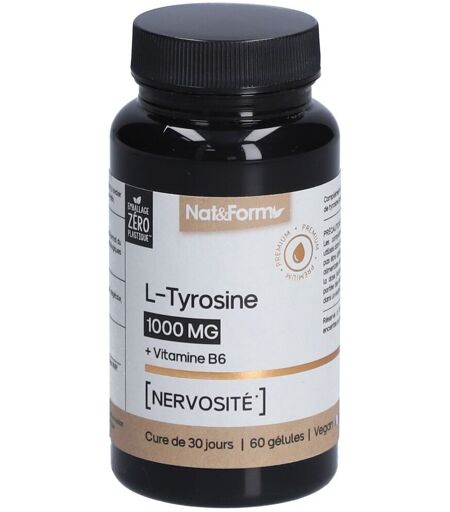 Complément alimentaire à utiliser dans le cadre d’une alimentation variée, équilibrée et d’un mode de vie sain.La Tyrosine est un acide aminé, précurseur des neurotransmetteurs comme la dopamine et la noradrénaline qui sont impliqués dans l'activité comportementale.Elle est également impliquée dans la production des hormones thyroïdiennes.La vitamine B6 contribue au fonctionnement normal du système nerveux. IngrédientsL -tyrosine, gélule d'origine végétale, chlorhydrate de pyridoxine (vitamine B6).Valeurs nutritionnelles Pour 1 géluleL-Tyrosine 1000 mgVitamine B6 2,8 mg (200% des VNR*)*Valeurs Nutritionnelles de Référence.Conseils d'utilisation2 gélules par jour.À avaler avec un grand verre d'eau, de préférence le matin.Précautions d'emploiLes compléments alimentaires doivent être utilisés dans le cadre d’un mode de vie sain et ne pas être utilisés comme substituts d’un régime alimentaire varié et équilibré. Ne pas dépasser la dose journalière préconisée. Tenir hors de portée des enfants. La conservation s’effectue dans un endroit sec et à l’abri de la lumière.Réservé à l'adulte. Déconseillé aux femmes enceintes ou allaitantes.Poids net35.8 g = 60 gélulesAdresse du FabricantLaboratoire Atlantic NatureZA de Kerloudan56270 PLOEMEURFrance ...