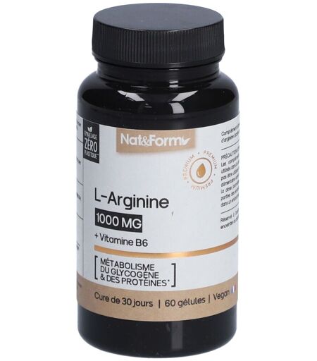 Complément alimentaire à utiliser dans le cadre d’une alimentation variée, équilibrée et d’un mode de vie sain.L’arginine est un acide aminé précurseur de la créatine, un dérivé d’acide aminé lié au développement et au fonctionnement musculaire, ce qui en fait l’allié idéal des sportifs. Elle est également précurseur d’oxyde nitrique (No) qui permet l’augmentation du flux sanguin vers les muscles pour améliorer l’apport en oxygène et en nutriments.Ses bienfaits sont multiples :Elle favorise par exemple la dilatation des vaisseaux sanguins. Cela permet d’augmenter son flux sanguin vers les muscles pendant l’exercice, fournissant ainsi plus d’oxygène et de nutriments.Elle favorise la récupération musculaire grâce à une meilleure circulation sanguine, permettant d’éliminer les déchets métaboliques produits lors de l’exercice, ce qui peut contribuer à une récupération musculaire plus rapide.Notre formule associe la L-Arginine à la Vitamine B6, qui contribue au métabolisme normal des protéines et du glycogène.Une formule VeganLa L-Arginine Nat&Form; est végane et soigneusement formulée pour répondre aux besoins nutritionnels sans compromettre les convictions éthiques : ainsi, la gélule est d’origine végétale.IngrédientsL-arginine, gélule d’origine végétale, chlorhydrate de pyridoxine (vitamine B6)Valeurs nutritionnelles Pour 2 gélulesL-arginine1000 mgVitamine B62,8 mg = 200% des VNR**Valeurs Nutritionnelles de Référence.Conseils d'utilisation2 gélules par jour.À avaler avec un grand verre d’eau, de préférence le matin.Précautions d'emploiLes compléments alimentaires doivent être utilisés dans le cadre d’un mode de vie sain et ne pas être utilisés comme substituts d’un régime alimentaire varié et équilibré. Ne pas dépasser la dose journalière préconisée. Tenir hors de portée des enfants. La conservation s’effectue dans un endroit sec et à l’abri de la lumière.Réservé à l'adulte. Déconseillé aux femmes enceintes ou allaitantesPoids net35.8 g = 60 gélulesAdresse du FabricantLaboratoire Atlantic NatureZA de Kerloudan56270 PLOEMEURFrance ...