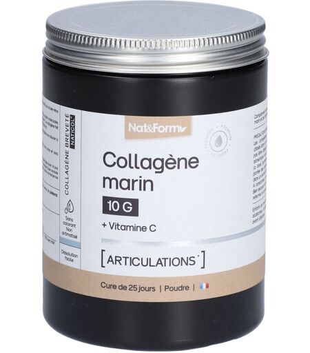 Complément alimentaire à utiliser dans le cadre d’une alimentation variée, équilibrée et d’un mode de vie sain.Le collagène est la protéine plus abondante dans l’organisme et assure l’intégrité, la fermeté et l’élasticité des tissus conjonctifs. Il fait notamment partie de la structure des cartilages, ligaments et tendons des articulations. À partir de 30 ans, sa production naturelle diminue progressivement. Cette diminution peut être la cause de désagréments articulaires et musculaires. Quels types de collagène ? Dans l’organisme, il existe 28 types de collagène différents par leurs structures, leurs abondances, leurs localisations et leurs fonctionnalités. Le collagène de type I est le plus abondant (90% du collagène total) et se retrouve dans la plupart des parties du corps dont la peau, les os, les tendons et les organes internes. Le collagène de type III est souvent associé au collagène de type I et se retrouve en grandes quantités dans les muscles et les vaisseaux sanguins.Le collagène Naticol® est majoritairement issu de collagène de type I et, en petites quantités, de type III.Notre collagène est hautement assimilable Grâce à un procédé d’hydrolyse enzymatique doux, les protéines de collagène natives de haut poids moléculaire (300 000 daltons) sont découpées en petits peptides de collagène plus solubles et plus assimilables par l’organisme grâce à leurs poids moléculaires plus faibles (2 000 daltons) qui permettent la traversée de la paroi intestinale. Une fois la barrière intestinale franchie, ces petits peptides vont être distribués aux différents tissus par le biais de la circulation sanguine.Pourquoi ajouter de la vitamine C ?La vitamine C contribue à la formation normale du collagène pour assurer la fonction normale des cartilages et des os. L’association du collagène et de la vitamine C fait de notre collagène marin en poudre le produit idéal en cas d’inconfort articulaire ou en prévention en cas d’activité physique forte.Sans sucre ni édulcorant Nous avons fait le choix de n’utiliser ni sucre ni édulcorant pour ce collagène, afin qu’il puisse aller dans vos préparations culinaires. Ainsi, vous pouvez le mélanger à vos pancakes, fromages blancs, smoothies, les jus de fruits, etc.BénéficesEfficacité scientifiquement prouvéeAméliore le confort articulaireAugmente la forme physiqueHaute assimilation (Collagène marin hydrolysé de type I et III)IngrédientsCollagène marin hydrolysé Naticol® (issu de peaux de POISSONS), acide L-ascorbique (vitamine C). Collagène : origine UE. Vitamine C : origine non UE.Allergènes : Poisson.Valeurs nutritionnelles Pour 2 cuillères doseusesCollagène marin hydrolysé Naticol® : 10 gVitamine C : 80 mg soit 100% des VNRVNR = Valeurs Nutritionnelles de Référence.Conseils d'utilisation10,1 g par jour, soit 2 cuillères doseuses, à dissoudre dans 200 ml d’eau ou de jus de fruit. Bien mélanger de préférence au shaker, ou à la cuillère, jusqu’à dissolution complète.Les deux cuillérées peuvent également être intégrées... ...