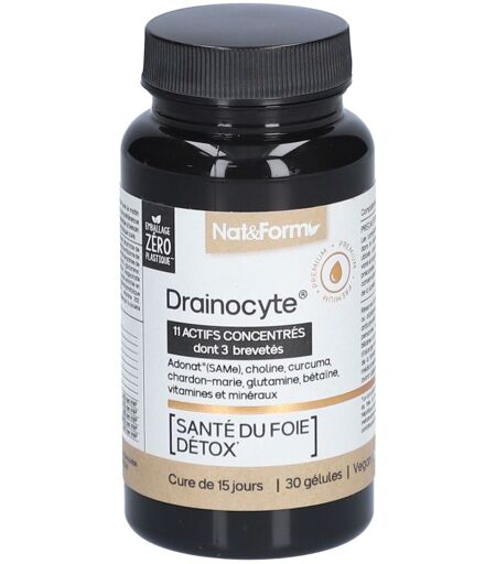 Complément alimentaire à utiliser dans le cadre d’une alimentation variée, équilibrée et d’un mode de vie sain.Drainocyte est un complément alimentaire conçu pour soutenir la santé du foie et favoriser la détoxification. Formulé avec 11 actifs concentrés, dont l'Adonat (SAMe), la choline, et des extraits de plantes comme le chardon-marie et le curcuma, il aide à protéger et régénérer les cellules hépatiques. Certifié vegan et adapté à une cure de 15 jours.IngrédientsAdonat® (S-Adénosyl-L-Méthionine), bitartrate de choline, extrait de curcuma, extrait de chardon-marie titré à 80% en silymarine, bétaïne, glutamine, vitamines B6, B9, B12, extrait de carotte, extrait de spiruline.Valeurs nutritionnellesCompositionPour 2 gélulesSAMe (S-Adénosyl-L-Méthionine)250 mgBitartrate de choline200 mgExtrait de curcuma150 mgExtrait de chardon-marie100 mgGlutamine100 mgBétaïne100 mgVitamine B614 mg (1000% des VNR*)Vitamine B9400 µg (200% des VNR*)Vitamine B1215 µg (600% des VNR*)Conseils d'utilisationPrendre 2 gélules par jour, une le matin et une le soir, avec un grand verre d'eau, de préférence 30 minutes après les repas. Cure de 15 jours, renouvelable si besoin après une pause de 1 mois.Précautions d'emploiConserver à l’abri de la lumière, dans un endroit sec et à température ambiante. Ne pas dépasser la dose journalière recommandée. Réservé à l’adulte. Déconseillé aux femmes enceintes ou allaitantes, aux personnes sous anticoagulants, ainsi qu'aux personnes souffrant de maladies des voies biliaires ou de troubles bipolaires. Les compléments alimentaires doivent être utilisés dans le cadre d'un mode de vie sain et ne peuvent remplacer une alimentation variée et équilibrée.Poids net16,8 g = 30 gélulesAdresse du FabricantLaboratoire Atlantic NatureZA de Kerouidan56270 PlœmeurFrance ...