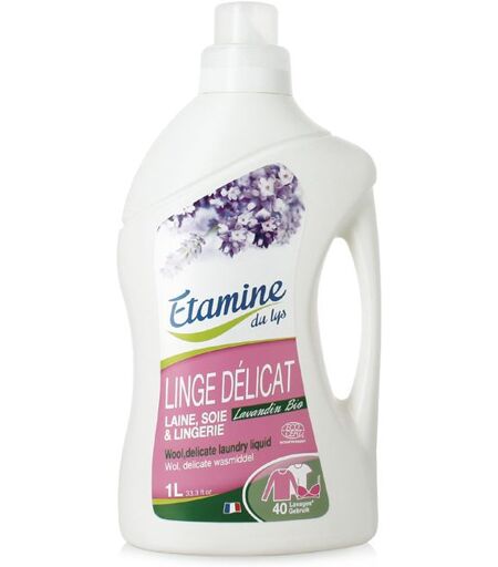 Parfum : huile essentielle de lavandin bio Economique 1L = 40 lavages Action anti-feutrage Idéal pour le linge noir ou foncé Ecodétergent certifié par ECOCERT Greenlife Non testé sur les animaux La lessive Linge délicat d'Etamine du lys est spécialement adapté au lavage de tous les textiles fragiles : soies, laines, lingerie. Cette lessive bio convient particulièrement pour le lavage du linge noir et foncé. Cette lessive liquide écologique, utilisable pour le lavage en machine ou à la main, défeutre la laine et protège les fibres. UTILISATION 1 bouchon = 30ml Les conseils de lavage sont donnés pour une machine de 2.5kg de linge. Convient pour un lavage à 30°/60°/90° Ne nécessite pas de prélavage. A la main : diluer 12.5ml de lessive dans 5 litres d'eau puis ajouter votre linge. En machine : 10 à 37,5ml selon la dureté de l'eau et la saleté du linge. Pour les 1/2 charges, diviser les doses par deux. Suivre les indications de lavages inscrites sur l'étiquette des textiles. Pour respecter l'environnement, faire tourner le lave-linge à pleine charge, privilégier les cycles de lavage à basse température et suivre les instructions de dosage. ATTENTION. Provoque une sévère irritation des yeux. Contient linalyl acetate. Peut produire une réaction allergique. INGREDIENTS 5 - 15% agents de surfaces non ioniques (coprah, palmiste, sucrières) Contient aussi : eau, sel, correcteur dacidité, séquestrants #Ingrédients naturellement présents dans les huiles essentielles *0.01% du total des ingrédients sont issu de l'Agriculture Biologique. 98.5% du total des ingrédients sont d'origine naturelle. CONSEILS Convient particulièrement pour le lavage à la main des collants et bas de contention. ...