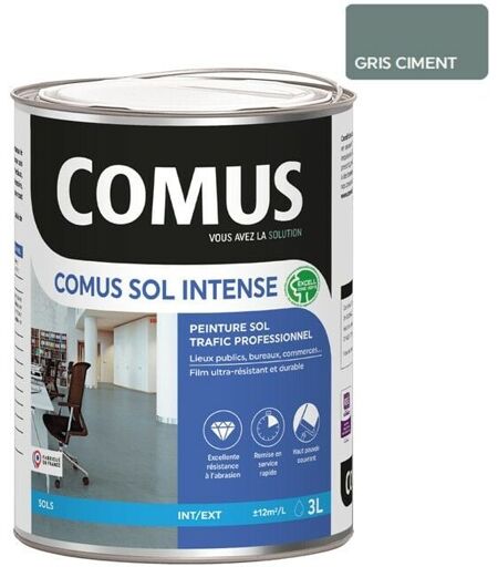 PROPRIÉTÉS ET AVANTAGES Fabrication française COMUS SOL INTENSE Peinture de protection et décoration des sols intérieurs et extérieurs, trafic professionnel. C'est une peinture en phase aqueuse à destination des lieux publics, bureaux, commerce...Excellente résistance à l'abrasion, aux taches et aux chocs. Certifiée Excell zone verte. Intérieur – Extérieur. SUPPORTS Béton neuf ou revêtu d'anciennes peintures, bois et parquet vitrifié, fibrociment, sol chauffant, ateliers, garages, locaux commerciaux, bureaux, magasins, zones de stockage. TEINTE ET ASPECT Aspect : Satin Coloris :Blanc, Noir, Gris ciment et Gris argent CONDITIONNEMENT 0.75L, 3L et 10L RENDEMENT 12m² / L OUTILS Pistolet airless, rouleau microfibre HD 12mm et brosse synthétique " Produit dangereux. Respecter les précautions d'emploi " ...