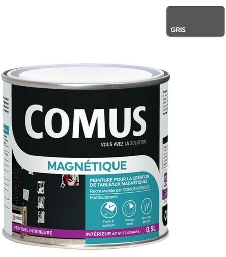 Description générale La peinture magnétique Comus est conçue pour créer des surfaces magnétiques sur différentes bases, permettant ainsi la fixation d'objets aimantés. Sa formulation à base de micro-particules de fer et de résine acrylique garantit une application facile, sans odeur et à séchage rapide. Elle peut être utilisée pour réaliser des tableaux magnétiques, y compris des tableaux d'école en combinaison avec la peinture ardoise Comus. Spécifications techniques Teinte : Gris Aspect : Mat Conditionnement : Disponible en 0,5 L et 3 L Rendement : 6 à 8 m²/L selon le nombre de couches appliquées Séchage : Sec au toucher en 1 heure, recouvrable après 4 heures Compatibilité et accessoires Supports compatibles : Bois et dérivés (MDF, contre-plaqué), anciennes peintures, plaques de plâtre, plâtre, enduit, béton, métaux non ferreux, verre, stratifié, céramique. Outils recommandés : Pistolet airless, rouleau polyester tissé 13mm, brosse spéciale phase aqueuse. Installation Préparer le ...