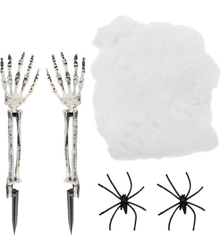 TEPPC-décoration Halloween Main Squelette réaliste 2 pièces + araignées + Toile Taille 46x9cm Mains squelettes articulées pour extérieur Jardin Effrayant et Ambiance cimetière