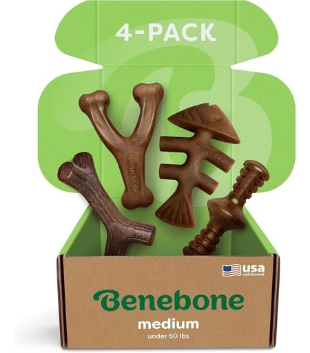 FOUR PACK! Savez-vous quoi de mieux qu'un Benebone ? Lot de 4. Votre chien a besoin d'un gros bâton.Robuste et durable Dur à prendre, même pour les masticateurs agressifs. Les Benebones résistent à chaque morsure pendant des semaines, car les vrais os ne peuvent pas rivaliser. À la place, prêt, mâchez !Véritable bacon. Nous utilisons uniquement du bacon 100 % authentique pour le meilleur goût. Vous ne pouvez pas tromper les gourmets à quatre pattes.FABRIQUÉ SOLIDE AUX ÉTATS-UNIS Vous avez besoin de solidité, nest-ce pas ? On comprend. Cest fabriqué et sourcé aux États-Unis.Plaisir garanti Vous avez des questions ou vous et votre chien êtes mécontents ? Écrivez-nous et un (vrai!) Les gens prennent soin de vos préoccupations, car la satisfaction des clients et des chiens est notre priorité. Expédié depuis la France et arrive sous 7 jours. ...