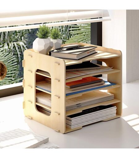 Organisateur de BureauLe support de stockage est convient à organiser les papiers A4, les dossiers, les magazines, les documents, et les livres, etc. C'est le premier choix pour le stockage des fichiers au bureau, à l'école et à la maison, et un bon assistant pour les travaux de comptabilité.Matériaux de Haute Qualité Les planches de notre support de rangement de bureau est fabriquées en bois de qualité supérieure, c'est un matériau égologique, non toxiques, sans odeur particulière, anti-usure, anti-oxydation, sans déformation et aucune protection spéciale n'est requise.Conception Humanisée Le panneau latéral utilise un design creux, ce qui est non seulement pratique pour le mouvement global du support de fichiers, mais aussi respirant et résistant à la moisissure et à l'humidité. La partition est conçue avec des rainures pour un accès facile aux fichiers et la conception de l'arc lisse ne rayera pas l'utilisateur, sûre et pratique.Structure SolideNous employons des planches de bois qui a une épaisseur de 5mm et le support de rangement équipe des anneaux en caoutchouc pour tous les joints des planches pour assurer le structure robuste et stable et une grande chargeur. La structure solide peut éviter le problème de renversement à cause de grandes quantités de documents stockés.Facile à AssemblerIl y a une instruction d'installation dans le paquet de notre support de rangement bureau, selon les instructions, vous allez l'installer dans 5 à 10 minutes. Tous les trous sur les plaques sont soigneusement disposés, aucun autre outil n'est nécessaire. Expédié depuis la France et arrive sous 7 jours. ...