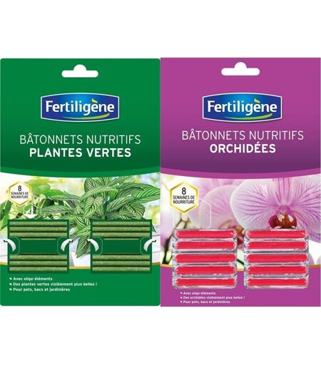 produit 1 Les bâtonnets d'engrais plantes vertes permettent d'obtenir des plantes encore plus vertes.produit 1 Action prolongée 8 semaines.produit 1 Floraison abondante et colorée.produit 1 Plantez les bâtonnets toutes les 8 semaines de février à novembre.produit 2 Les bâtonnets nutritifs orchidées Fertiligène permettent d'obtenir de magnifiques orchidées à la floraison abondante et durable.produit 2 Ils préviennent également le jaunissement des feuilles.produit 2 Ne nourrissez vos orchidées que lorsqu'elles sont en période de croissance (floraison, apparition de bourgeons, de jeunes feuilles ou de nouvelles racines).produit 2 Période d'utilisation Toute l'année. Expédié depuis la France et arrive sous 7 jours. ...