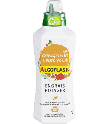 Engrais liquide adapt¿¿ pour la fertilisation de tous vos fruits et l¿¿gumes du potager. Favorise la croissance et la fructification pour des r¿¿coltes abondantes et de qualit¿¿. Id¿¿al pour les potagers et carr¿¿s potagers au jardin, balcon et terrasseDosage de l'engrais simple et pr¿¿cis grace au bouchon doseur gradu¿¿ inclus et aux doses demploi au dos du produit. Verser lengrais ¿¿ lint¿¿rieur du bouchon. Remplir le bouchon jusquau niveau 1, verser dans 1 L deau et fertiliser en arrosantP¿¿riode de fertilisation 1 ¿¿ 2 fois par semaine entre mars et octobre100% Naturel, Utilisable en Agriculture Biologique (Conform¿¿ment ¿¿ la r¿¿glementation europ¿¿enne en vigueur) et 100 % Vegan. ENGRAIS NF U 42-011 NK 3.5,3, Flacon ¿¿ partir de 90% de plastique recycl¿¿Contenu ALGOFLASH Organic & Recycl¿¿ Engrais Liquide Potager UAB, Volume 1 L, ALIPOTRECY1 Expédié depuis la France et arrive sous 7 jours. ...