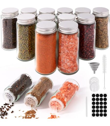 Spwb-Ronds Pot À Épices En Verre, 12 X 120ml Bocaux À Épices Françaises Avec Couvercle Hermétique, Boite A Epices Cuisine Rangement Avec Tamis, 48 Étiquettes Vierges, Stylo, Entonnoir