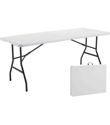 DESCRIPTION GÉNÉRALE Table pliante buffet, traiteur - Lot de 10. Ensemble de 10 tables pliables de 180 cm, utilisables en intérieur comme en extérieur grâce à leur structure en acier époxy et leur plateau en résine plastique. Facilement transportables et stockables, elles se transforment en format valise avec une poignée de transport intégrée. Chaque table peut supporter jusqu'à 150 kg et dispose de patins anti-dérapants. SPÉCIFICATIONS TECHNIQUES Dimensions ouvert : L.180 x l.75 x H.74 cm Dimensions fermé : L.90 x l.75 x ép.8 cm Nombres de places assises : 8 personnes Matière : Structure en acier finition peinture époxy noire, Plateau en Polyéthylène Haute Densité (PEHD) Section de la structure : Ronde, Diam. 28 mm x Ép. 1,2 mm Couleur : Piétement noir - Plateau blanc Charge maximum supportée : 150 kg Poids : 13 kg par table Usage : Professionnel intensif, intérieur/extérieur Les + du produit : Table pliante au format valise, solide et robuste, résistante aux chocs et aux fissures ...