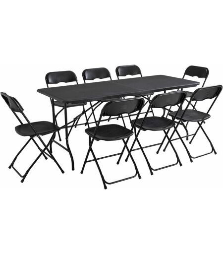 Table pliante et 8 chaises d'appoint noires. Cet ensemble table et chaises de réception sera parfait pour vos événements intérieurs comme extérieurs. Leur structure en acier époxy et leur plateau en résine plastique (PEHD) ne craignent ni l'humidité ni les UV. La table d'appoint dispose de pieds rabattables et le plateau se plie en deux pour transformer la table au format valise. Vous pourrez ainsi l'emmener partout grâce à sa poignée de transport et la ranger facilement. La table camping peut supporter 150 kg de charge. Les chaises pliables disposent de patins anti dérapants et peuvent supporter 110 kg de charge. Ces chaises sont empilables une fois pliées. Dimensions ouvert Table: L.180 x l.75 x H.74 cm - Chaise: L.40 x l.45 x H.81 cm Dimensions fermé Table: L.90 x l.75 x ép.8 cm - Chaise: H.97 xl.40 x ép.3 cm Nombres de places assises 8 personnes Matière Structure: acier avec finition peinture époxy. Plateau et assise: Polyéthylène Haute Densité (PEHD) Section de la structure ...