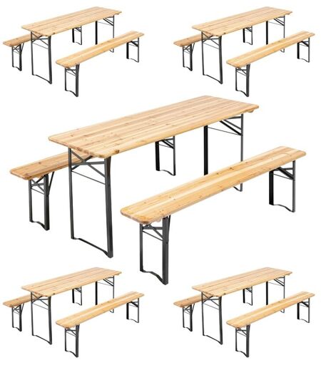 Lot de 5 ensemble table et bancs pliants en bois - Cet ensemble brasserie en bois de pin verni de 180 cm est idéal pour les professionnels qui veulent augmenter leur nombre de places assises lors d'événements. Les pieds de la table en bois et des bancs se rabattent pour un stockage simplifié. Les pieds sont sécurisés grâce à une système de blocage par loquet. Chaque table de réception peut supporter 200 kg de charge et chaque banc 350 kg. Vous pourrez installer jusqu'à 8 personnes par ensemble pique nique. Dimensions ouvert Table: L.180 x l.60 x H.76 cm - Banc: L.180 x l.25 x H.46 cm Dimensions fermé Table + 2 bancs: L.181 x l.61 x ép.12 cm Nombres de places assises 8 personnes par ensemble Matière Structure: acier avec finition peinture époxy noire - Plateau: sapin Section de la structure Structure de section carrée - Cornières: 28x28mm - Epaisseur 2mm Couleur Piétement noir - Plateau bois Charge maximum supportée Charge maximum supportée pour la table 200kg - Charge maximum ...