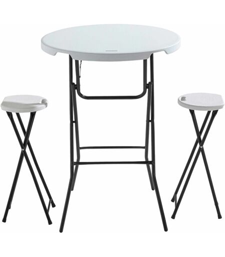 Table mange debout pliant et 2 tabourets pliants. Associez ce mange debout pliable et ces tabourets haut pour tous vos événements. Avec leur structure en acier époxy et leur plateau en PEHD, cette table et tabourets pliants conviendront en intérieur comme en extérieur. La table mange debout fait 80 cm de diamètre et 110 cm de haut, et peut supporter 100 kg de charge. Les tabourets pliants peuvent supporter 100kg de charge et font 70 cm de haut. La table et les tabourets sont pliants afin de faciliter leur rangement et les emmener partout. Dimensions ouvert Tabouret : Diam.35 x H.70 cm - Mange debout : Diam.80 x H.110 cm Dimensions fermé Tabouret: H.95 x l.31 x ép.4 cm - Mange debout: H.138,5 x l.80 x ép.5 cm Nombres de places assises 2 personnes Matière Structure en acier finition peinture époxy noire. Plateau: Polyéthylène Haute Densité (PEHD) Section de la structure Tabouret: Tubes de section rond, diamètre 20mm - Mange-debout: Structure ronde de section Diam. 19 mm Couleur ...
