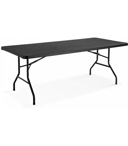 Description générale Grande table pliante de réception pour buffet, traiteur et événements. Cette table pliable de 183 cm est équipée de pieds rabattables, facilitant son transport et son stockage à plat. Sa structure en acier époxy et son plateau en polyéthylène haute densité (PEHD) lui permettent d'être utilisée à l'intérieur comme à l'extérieur, résistant à l'humidité et aux UV, avec une capacité de charge allant jusqu'à 200 kg. Les pieds sont sécurisés par des bagues coulissantes et dotés de patins antidérapants pour garantir la stabilité. Spécifications techniques Dimensions ouvertes : L.183 x l.76 x H.74 cm Dimensions fermées : L.183 x l.76 x ép.5 cm Nombre de places assises : 8 personnes Matière : Structure en acier avec finition peinture époxy noire, plateau en polyéthylène haute densité Section de la structure : Tube de section ronde diam. 28 x ép. 1,2 mm, structure sous plateau rectangulaire 30x15 mm, barre de renfort centrale 20x20 mm Couleur : Piétement noir, plateau noir ...