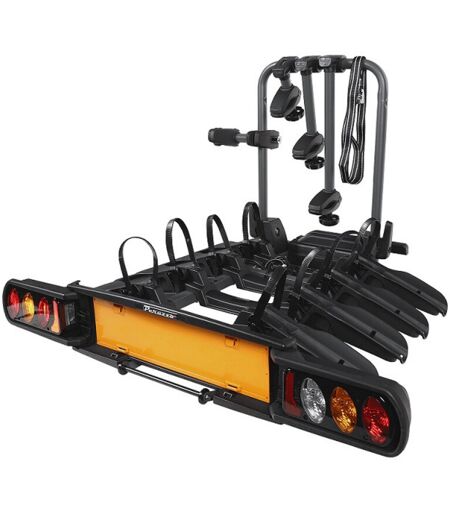 Le Peruzzo Pure Instinct 4 peut transporter jusqu'à 4 vélos pour une charge totale de 60 kg (15 kg max par vélo) ! Idéal pour les excursions en famille, il peut également transporter des Fatbikes aux roues larges ! Facile et rapide à installer sur votre rotule d'attelage grâce à son levier de serrage verrouillable. Le Pure Instinct 4 vous laissera l'accès à votre coffre grâce à son système de basculement intégré. Il est muni d'une prise électrique 13 broches. Les vélos sont fermement maintenus au niveau des roues par des courroies crantées résistantes et sur les cadres par des bras de fixation réglables pour les 3 premiers vélos et un bras reliant les cadres du troisième et quatrième vélo pour ce dernier. Une longue sangle faisant le tour des cadres des vélos ainsi que des sangles de sécurité se fixant sur le hayon complètent l'ensemble pour assurer un bon maintien. Un vélo avec un empattement maximal de 120cm sera compatible grâce à une extension de rail fournie. Si vous devez transporter plusieurs vélos avec un tel empattement, il sera nécessaire de commander des extensions supplémentaires (voir référence PER23.985 dans les accessoires). Repliable, il pourra aisément être rangé dans le coffre du véhicule ou stocké dans votre garage lorsque vous ne l'utiliserez pas. Remarque : Ce porte-vélos est incompatible avec les rotules RMC / RMC-pin (rotules de marque Brink pour véhicules non autorisés à tracter). Possibilité d'ajouter le porte-bagage GP pour transformer votre porte-vélos en porte-bagage (disponible en accessoires ci-dessous).Ses principaux atouts : verrouillable sur la rotule, basculable, transporte jusqu'à 4 vélos (60 kg) dont les Fatbikes, repliable. ...