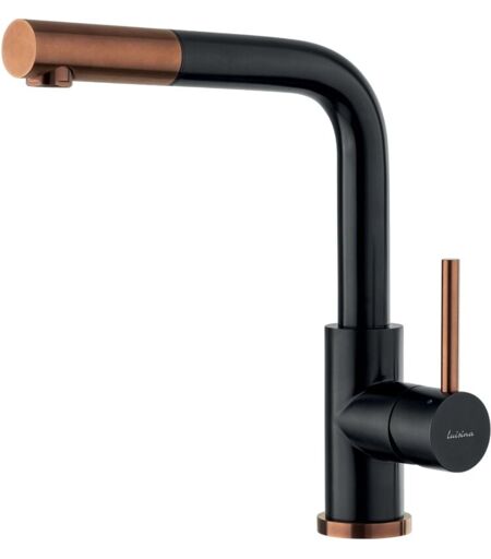 POINTS FORTS : • Robinet inox H 290 x L 220 mm • • Douchette extractible mono jet • • Mitigeur pour cuisine • • Robinetterie cuisine avec flexibles CARACTÉRISTIQUES : • Débit à 3 bars : 8.51 l/min • Degré de rotation : 160° • Limiteur de température : non • Type de bec : bec coudé • Flexible de raccordement : oui • Normes / Certifications : normes Européennes 1111-817-1717 / ACS Attestation de Conformité Sanitaire • Douchette : douchette mono jet • Marque : Luisina • Coloris : Noir et cuivre • Type de mécanisme : Cartouche à disque céramique • Poids brut (Kg) : 2.96 • Poids net (Kg) : 2.96 • Diamètre de la base (mm) : 54 • Hauteur sous bec (mm) : 255 • Longueur du bec (mm) : 220 • Diamètre de perçage : 35 • Hauteur (mm) : 290 • Bon à savoir : ce produit ne présente pas de spécificités supplémentaires ...