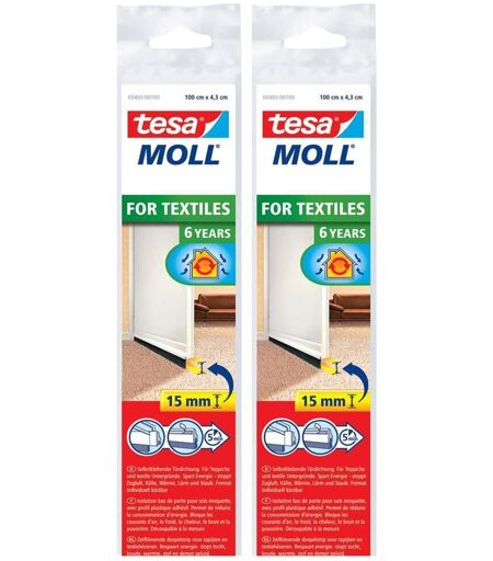 tesa Moll calfeutrage bas de porte pour sol textille, blanc pour largeur de fissure jusqu'à 15 mm stopp le bruit, la poussière, le courants d'air et le froid (05403-00000) Bas de porte adhésifSpécial sols légèrement irréguliersBrosse bas de porte adhésive pour se protéger des courants d'air, du froid et de la poussière.Fibres en nylon de grande qualité garantissant une obturation parfaite.Fibres fixes et souples; Spécial moquettes épaisses; Pour des espaces jusqu'à 15mm; Durée de ... ...