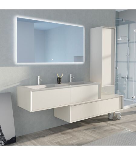 Meubles de salle de bain 140cm double vasque tendance : AVIGLIANO-1400B Avec sa grande vasque de 140cm et son meuble sous vasque aux nombreux rangements, l'ensemble de meubles Avigliano 1400B au teintes Blanche répondra aux besoins de toute la famille. Grâce à ce meuble design de 140cm vous bénéficierez de plusieurs espaces de rangements, se séparant entre les 4 tiroirs et la grande colonne à porte. L'ensemble est équipé d'une double vasque blanche en résine qui souligne le côté très tendance de l'ensemble avec ses lignes minimalistes. Un grand miroir panoramique viendra parfaire votre salle de bain. Grâce à son éclairage à LED intégré et son interrupteur tactile, son utilisation est très simple. Ce meuble de salle de bain design 140cm est idéal pour équiper les salles de bain spacieuses et s'intègre à merveille dans une décoration moderne. Ses couleurs claires apportent de la lumière dans la pièce. Meuble équipé du système Push open ------ Livré sans robinetterie (uniquement bonde), sans flexible. Le + : Ses multiples rangements. ...