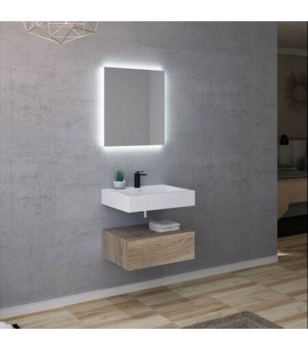 Ensemble meuble de salle de bain scandinave 60 cm : AVELLINO-600SC Cet ensemble de salle de bain 60 cm suspendu comportant vasque et meuble est idéal pour une petite salle de bain minimaliste. La vasque en Solid Surface haut de gamme est livrée avec sa bonde Push-up. Sous sa vasque, le caisson de rangement vous permet d'y ranger tous vos produits d'hygiènes. Le meuble de salle de bain scandinave 60cm est équipé du système push-open pour une ouverture facile. Un miroir éclairé par LED via un bouton tactile, complète cet ensemble de salle de bain 60cm. Meuble équipé du système Push open. ------ Livré sans robinetterie (uniquement bonde Push&Up),; et sans flexible. Le + : Sa petite dimension ...