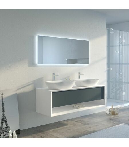 Découvrez notre meuble de salle de bain Bellano blanc et gris béton 140 cm !Notre meuble de salle de bain Bellano blanc et gris béton 140 cm est un meuble de salle de bain suspendu à installer avec une double vasque. Il dispose notamment de deux grands tiroirs pour ranger vos affaires de toilette ou encore votre linge de bain en toute discrétion, mais aussi d'une grande niche pour y installer vos produits les plus fréquemment utilisés ou encore des accessoires de décoration par exemple.Les matériaux utilisés pour notre meuble double vasque 140cm sont de grande qualité afin de vous assurer une longue durée de vie, mais aussi un aspect tout à fait élégant. Ce meuble de salle de bain suspendu est également équipé du système Push-Open ainsi que d'un miroir panoramique rétroéclairé.Une salle de bain moderne avec un meuble de salle de bain suspenduAvec le meuble de salle de bain Bellano blanc et gris béton 140 cm, il est possible de faire le choix d'un meuble de salle de bain suspendu afin ...