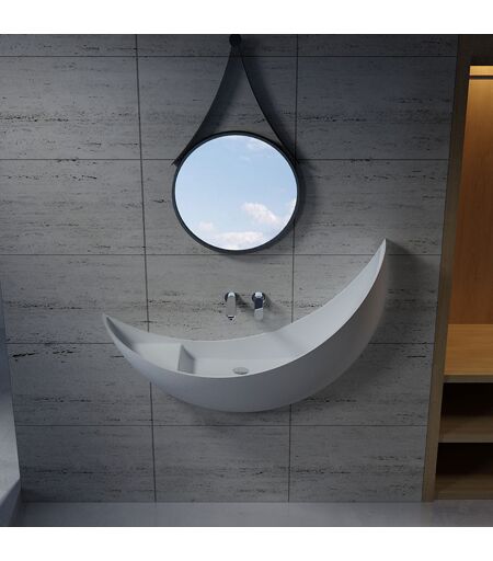 Vasque murale lune en solid surface SDV35 Découvrez le charme de cette vasque murale en croissant de lune. Cette vasque suspendue au style romantique apportera de l'élégance à votre salle de bain. Entièrement moulée en solid surface, elle est résistante et lisse avec une finition mate très moderne. A l'intérieur de la vasque demi-lune SDV35, vous disposerez d'un espace porte-savon et d'une bonde push&up; très pratiques. Livrée sans robinetterie, sans siphon. Livrée avec bonde push&up. ...
