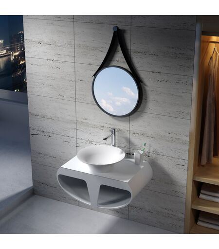 Plan de toilette avec vasque ronde en solid surface SDK55 + SDV32 Ce petit ensemble plan de toilette et vasque ronde en solid surface meublera parfaitement votre salle de bain. Le plan de toilette suspendu en demi-lune est composé de deux niches ouvertes. Il est pré-percé pour le robinet de votre choix et accueille la vasque ronde SDV32. Cette dernière est livrée avec sa bonde push&up; très pratique. Le solid surface, autrement appelé fonte minérale, est un matériau robuste et moderne avec une finition blanc mat très élégante. Livré sans robinetterie, sans siphon. Livré avec bonde push&up. ...