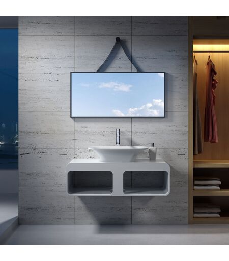 Plan de toilette avec vasque rectangulaire en solid surface SDK52 + SDV36 Adoptez ce plan de toilette suspendu d'un mètre de large et sa vasque rectangulaire évasée pour une salle de bain au look résolument moderne. En effet, cet ensemble plan de toilette et vasque en solid surface design et à la finition blanc mat offre un rendu très actuel. Les lignes épurées du plan de toilette dessinent deux niches ouvertes. La vasque vient se poser dessus tout en laissant un bel espace libre pour vos savons et brosses à dents. Vous pourrez assortir cet ensemble à notre miroir SDVM10045 pour un rendu encore plus graphique. Livré sans robinetterie, sans siphon. Livré avec bonde push&up. ...