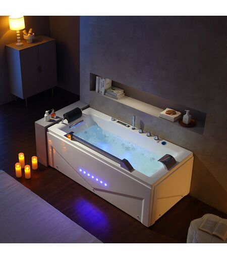 Baignoire balnéo rectangulaire de luxe spa Cleveland Droite 46 jets Choisissez la baignoire Cleveland pour ses performances. L'une des meilleures de sa catégorie grâce à ses 24 injecteurs d'air dont 2 avec avec chromothérapie, 6 Jets d'eau et d'air dorsaux, 1 cascade pour un massage des cervicales, 4 jets d'eau et d'air plantaires, 12 jets d'eau et d'air latéraux soit un total de 4 jets au service de votre corps. Equipée de sa nouvelle commande tactile multifonction avec télécommande, vous régulez la pression des jets d'hydromassage au son de vos musiques préférées via la connexion CD intégrée. La cascade cervicales dont elle dispose vous assure une béatitude complète. La pause détente optimale à votre domicile! Le + : Choisissez la finition droite ou gauche pour une intégration parfaite dans votre salle de bain. ...